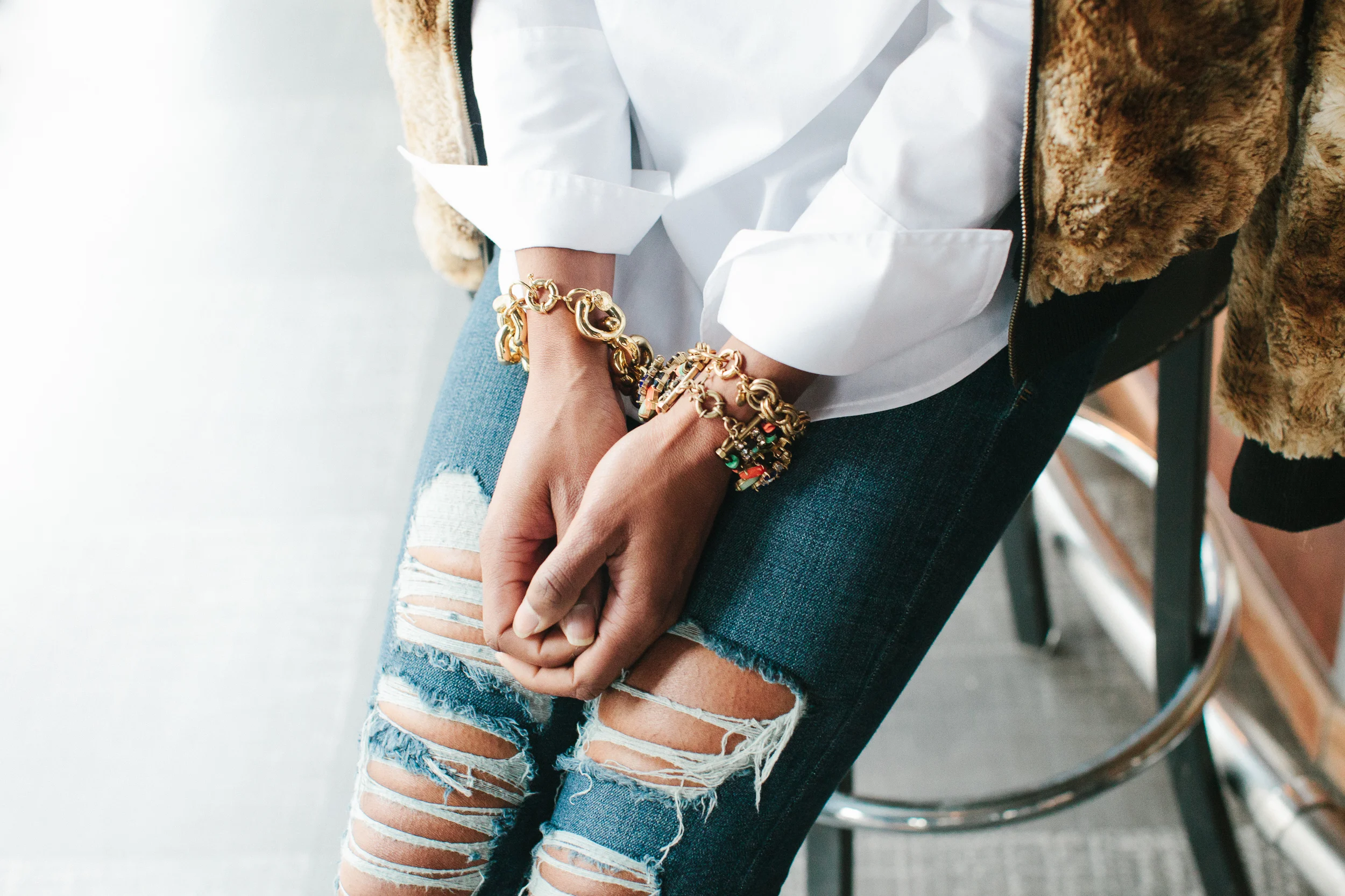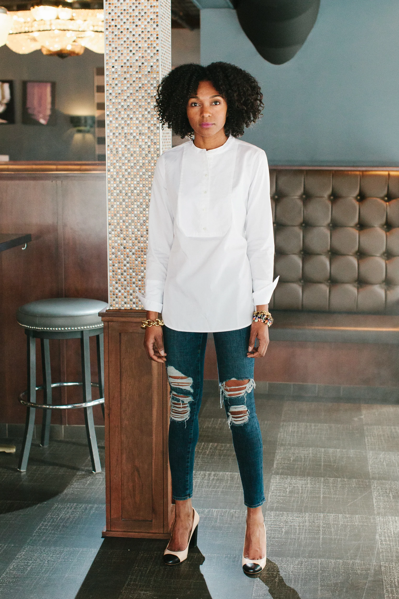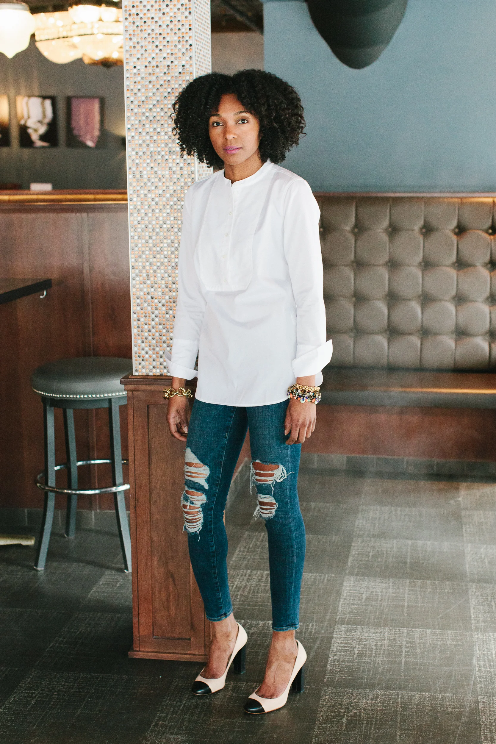 When you're rushing to get out the door, wardrobe staples will be your hallelujah "wear this" saver! Classic, timeless, easy and it looks good on you, yep that's what great wardrobe staples provide. That's pretty much what I look for when it comes to creating a cohesive wardrobe. On days when I can't even think about upping the cuteness, classics like this white shirt, swoop in, saving my outfit and sanity. The tuxedo style of this shirt adds a polished look to a great basic. Time savers like this allows me to get dress fast and have a look that still makes me feel good. That's the whole point right, you gotta feel good in it. I finished the look with some distressed skinny jeans ( you can easily go with classic dark wash denim) and a few fun bracelets. I'm out the door and I hope you are as well ready to tackle your day like a boss. Have a fabulous one my awesome peeps.